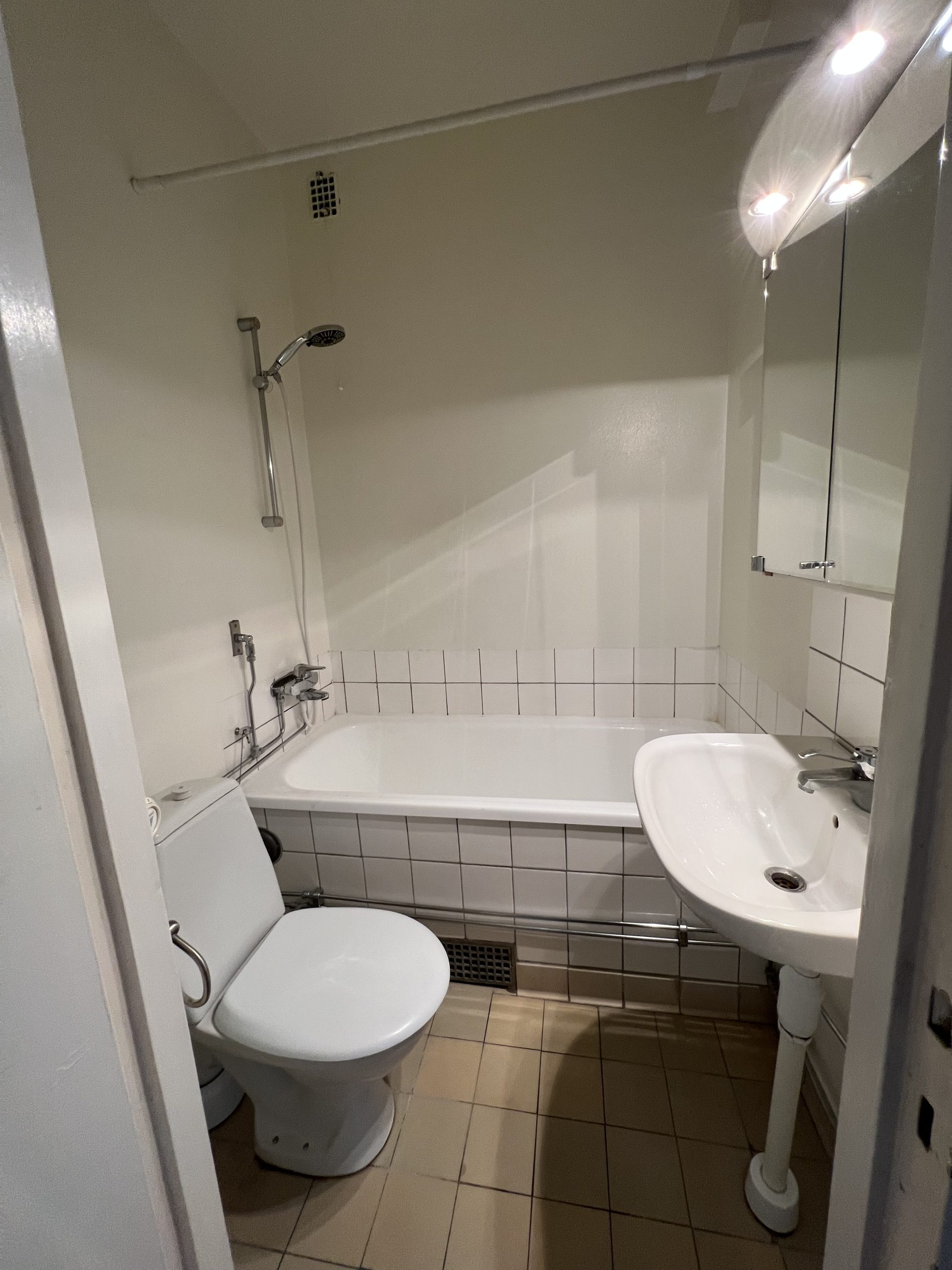 är ljus och trevlig med gammal standard i kök och badrum. Badrummet